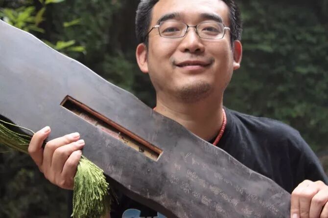 青城山留影。所抱之琴即为文中所述何明威先生题刻古歌谣之“若缺”